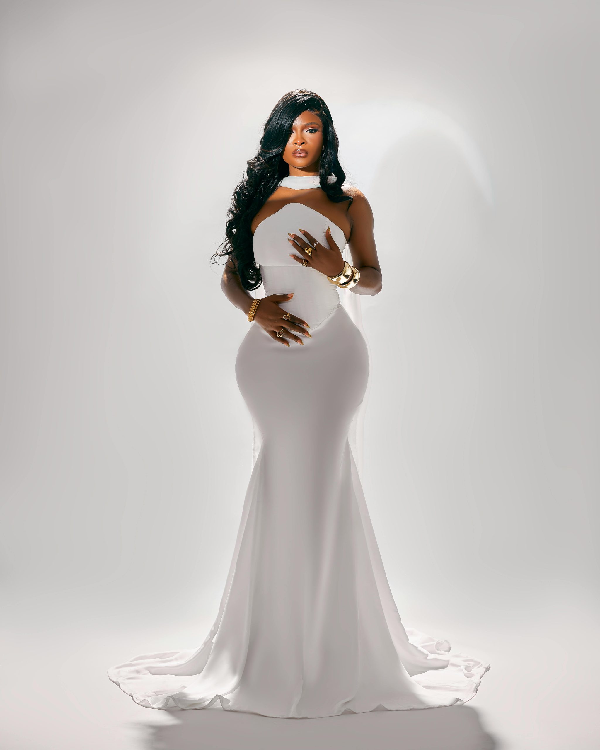 Adding to the gown’s grace is a high neckline with a light draped veil around the arms, creating an ethereal and refined touch. This detail enhances the overall elegance while providing a subtle sense of mystery.
